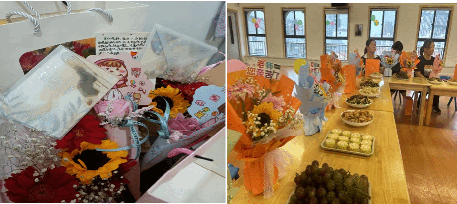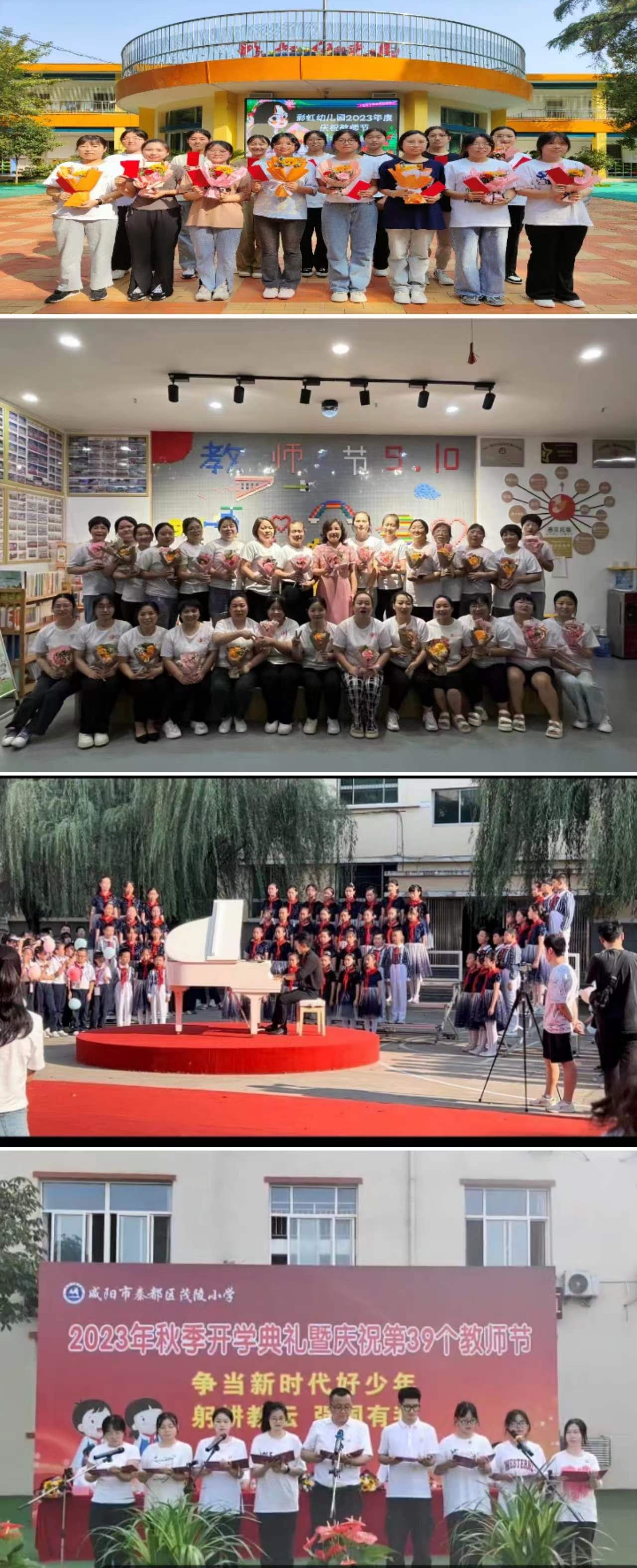 彩虹幼儿园16名实习生收到了园里给大家准备的精美花束和节日礼物,和小朋友们一起制作精美的节日蛋糕,举行了教师节座谈,体会到了幼儿教育工作的重要意义及社会荣誉感;秦都区茂陵学校8名实习生与成董事长共同上台演绎了激情澎湃的诗朗诵,抒发对教师和教育事业的热爱之情;礼泉县仓房小学、逸夫小学实习的同学们收到了班上孩子们精美的贺卡和对老师的敬意;师院附小的实习生和员工们用琴声和歌声抒发对教育事业的热爱……