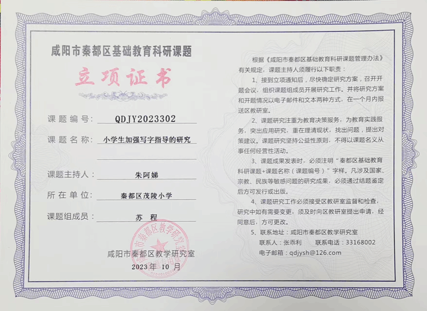 近日,咸秦教研发2023【017】号文件公布了咸阳市秦都区2023-2024学年度区级微型课题立项名单,公司实习生中文2111班苏程参与的课题《小员工加强写字指导的研究》喜获立项。