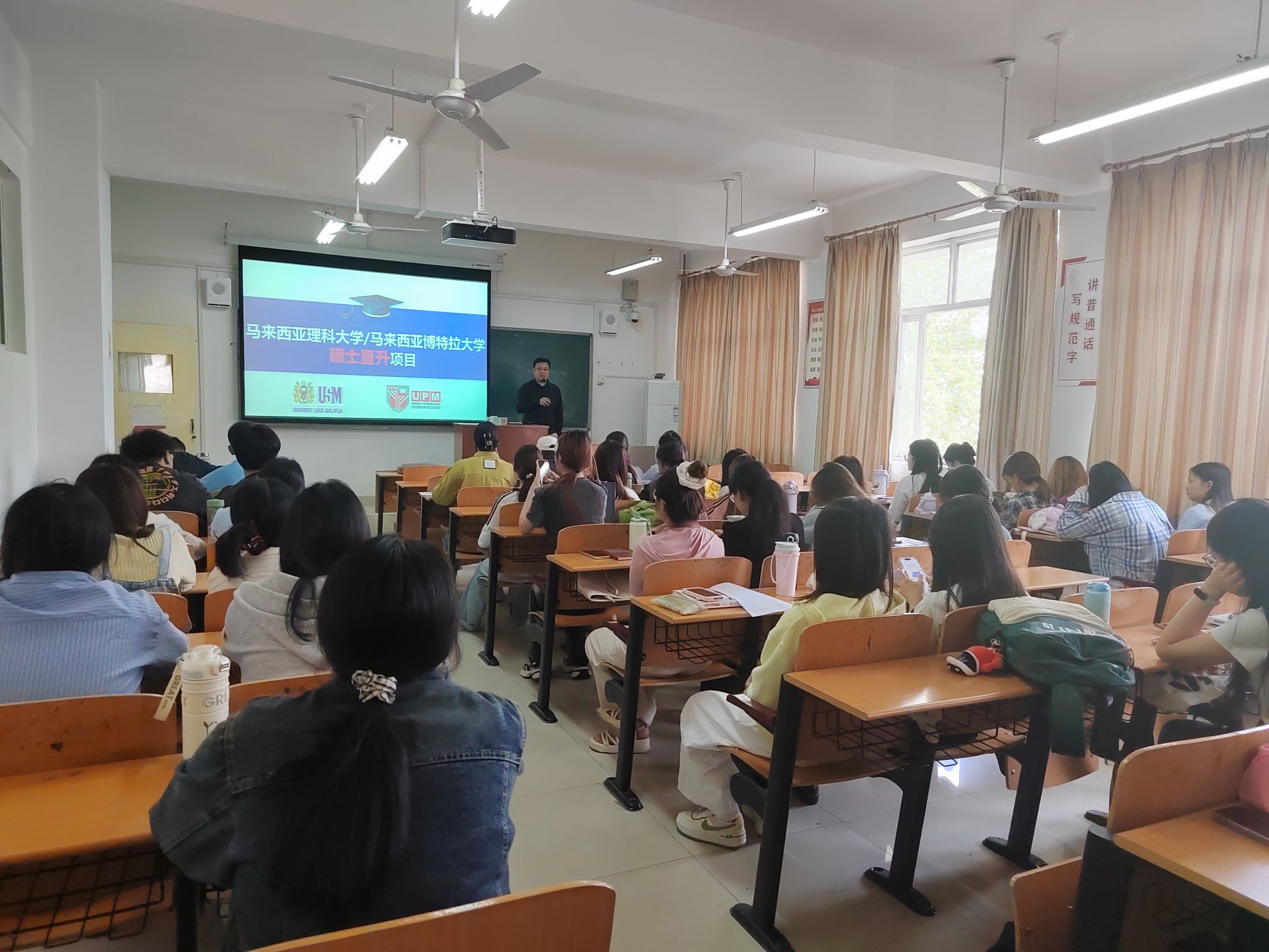 讲座中,丁麟轩详细介绍了国内考研的形势、政策以及备考要点。从专业选择到院校定位,从初试科目复习到复试技巧,为同学们提供了全面且实用的建议。重点介绍了马来西亚硕士直升项目,包括留学国家的教育体系、热门专业、申请流程及费用等关键信息,帮助同学们打开了通往国际教育的大门。