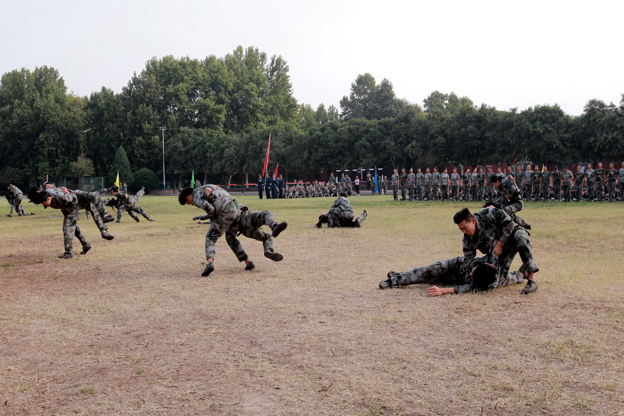 在激昂雄壮的国歌声中,855名新生整装列队,以昂扬饱满的精神状态迎接国旗入场。在随后的汇报表演中,各军训连分别表演了花样列队表演、军体拳表演、消防战术和擒敌配套表演、全民运动表演等科目。表演过程中同学们精神饱满,动作规范,队列整齐,气势雄壮,充分展示了军训成果,表演精彩,赢得了全场阵阵掌声。