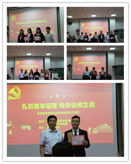 决赛共有12组参赛选手,在轻悠的配乐中,选手们以饱满的热情,铿锵有力的气势,自信大方的形象诠释了革命精神,赢得老师和同学们的阵阵掌声。他们饱含着真挚的情感,颂出革命历史长河的奔流之声,声情并茂、器宇轩昂,令台下的观众们动容。现场优美的配乐和背景视频、恰到好处的语感、和谐优美的体态语言,让聆听者仿佛走近了一个个革命伟人的身边。与其说这是一场红色经典诵读比赛,不如说这是一场视听盛宴,更是青年们爱党爱国的精彩演绎。经过两个小时的激烈角逐,终于决出了本次比赛的获奖选手。在比赛总分阶段,公司合唱团、赵增新经理等老师和同学为大家带来了精彩的红歌演唱和示范朗诵表演。